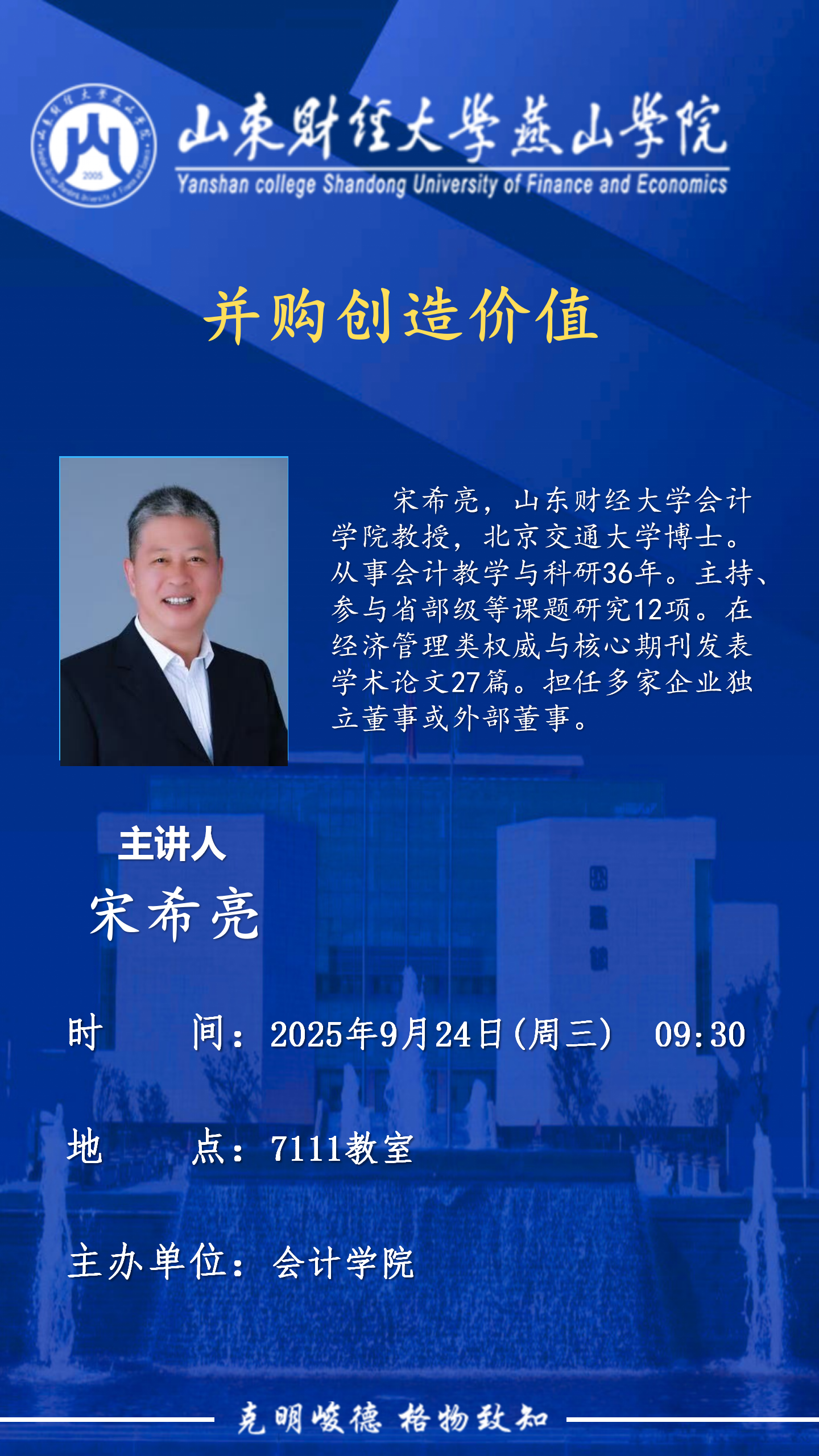 本次学术讲堂将由山东财经大学yl88858永利集团教授宋希亮主讲,主题为:并购创造价值。